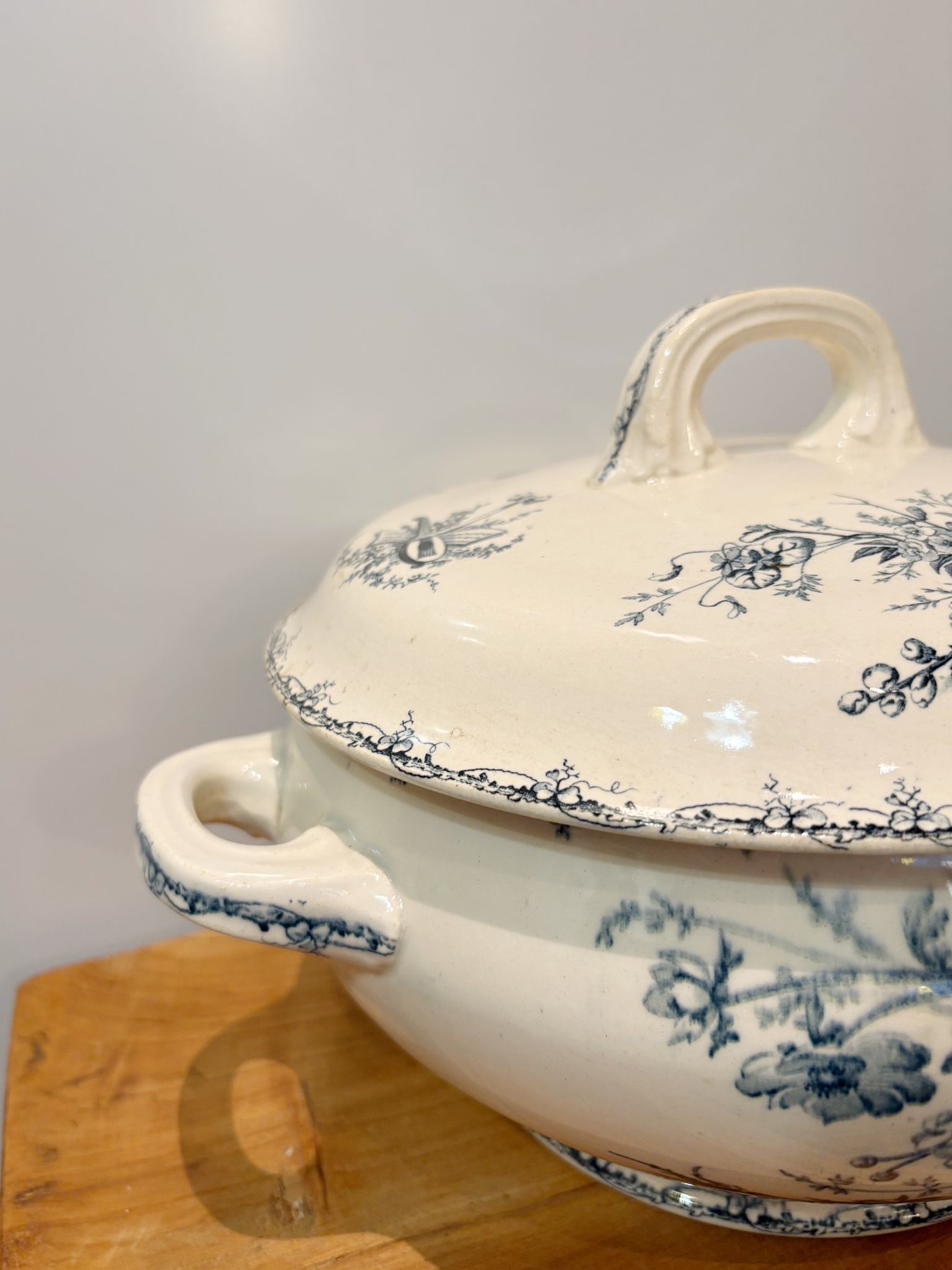 Charmante soupière ancienne en faïence, type "Terre de fer", avec ses motifs champêtres bleus.