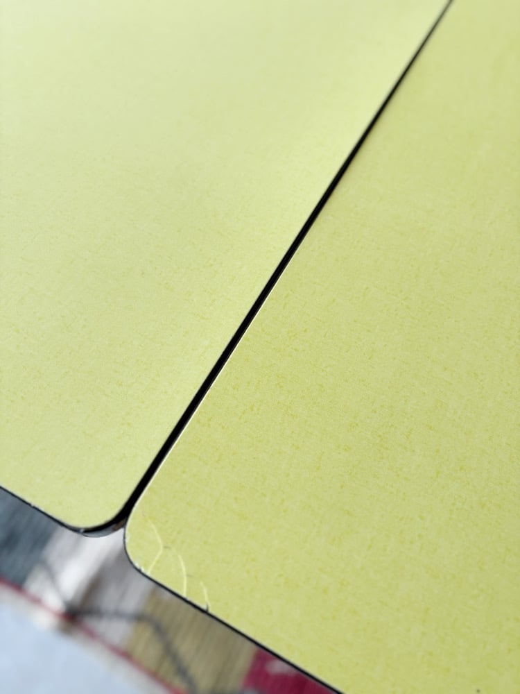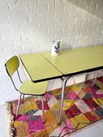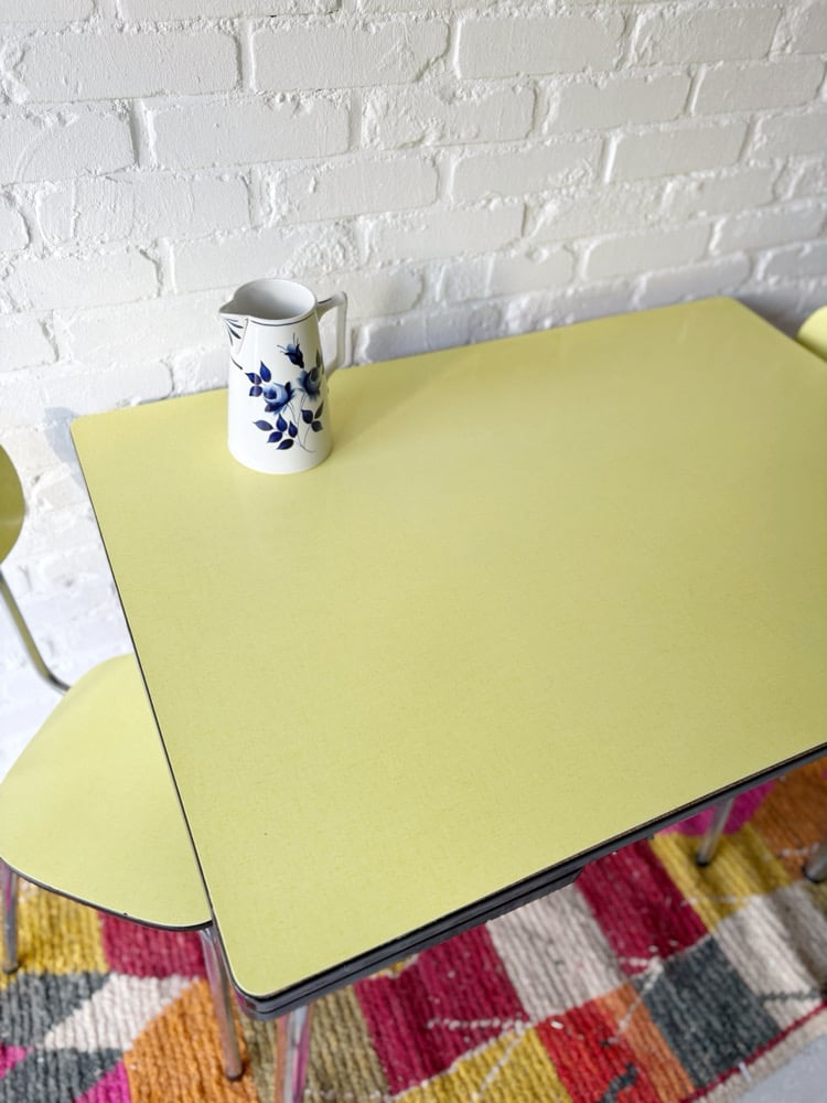 Bel ensemble en Formica vintage jaune comprenant une table et des 2 chaises.