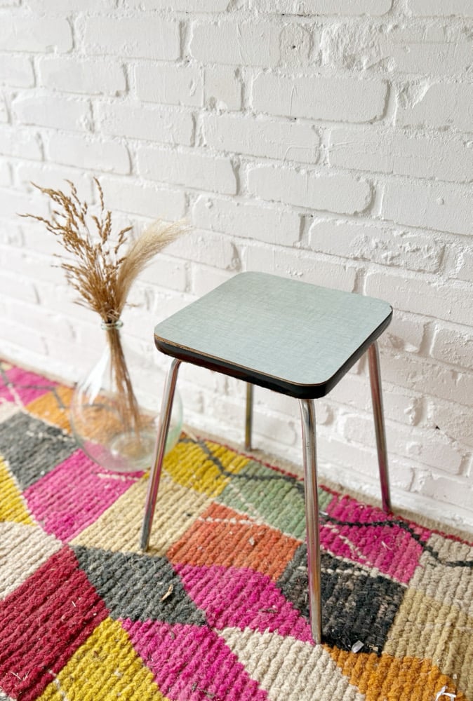 Adorable tabouret en Formica, vert d’eau, vintage.